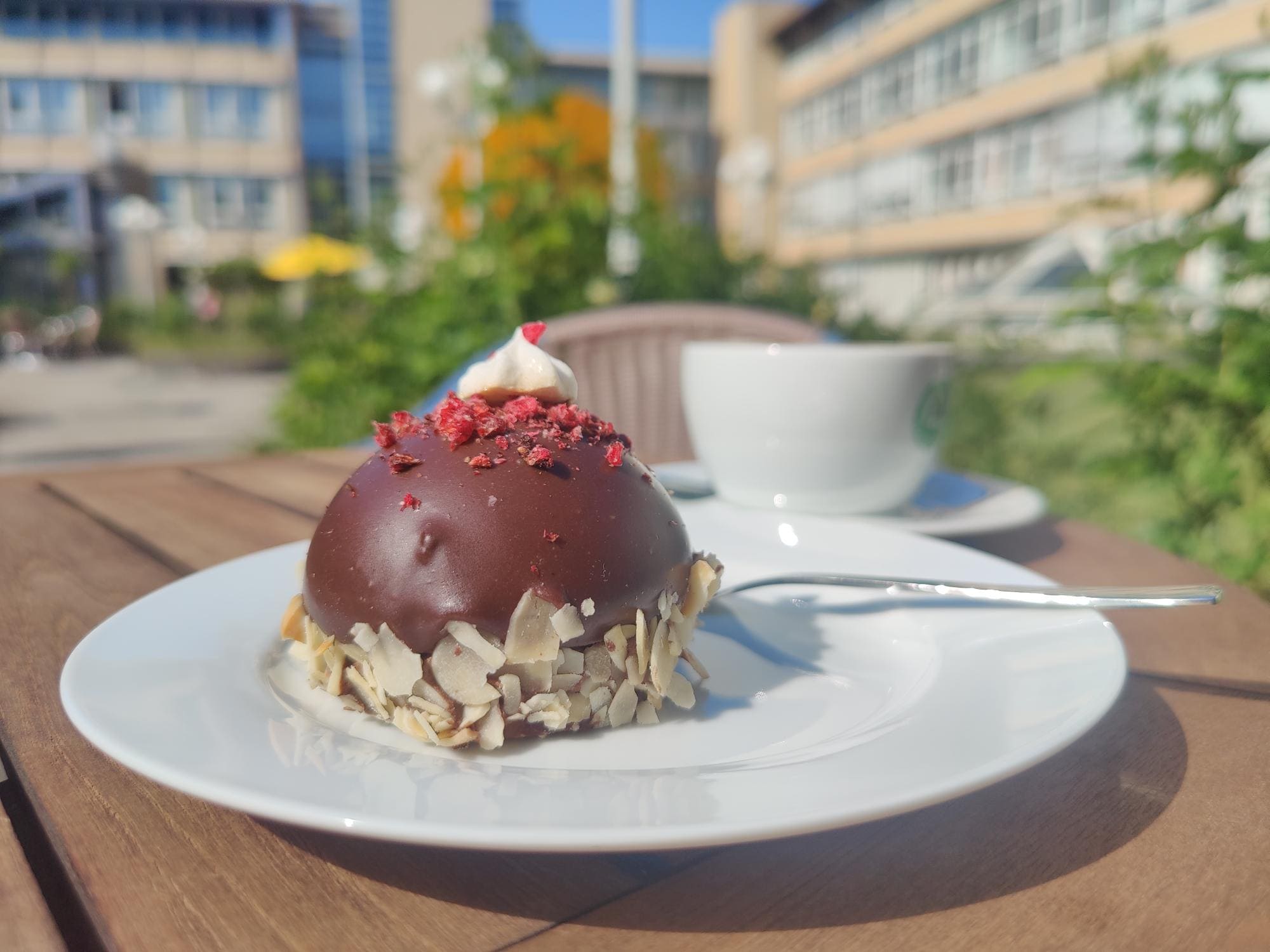 An sonnigen Tagen lädt der Rosengarten im großzügigen Innenhof zum Verweilen im Freien ein. Umgeben von Blumen, Grün und Ruhe wird Ihr Cafébesuch zu einem kleinen Kurzurlaub.